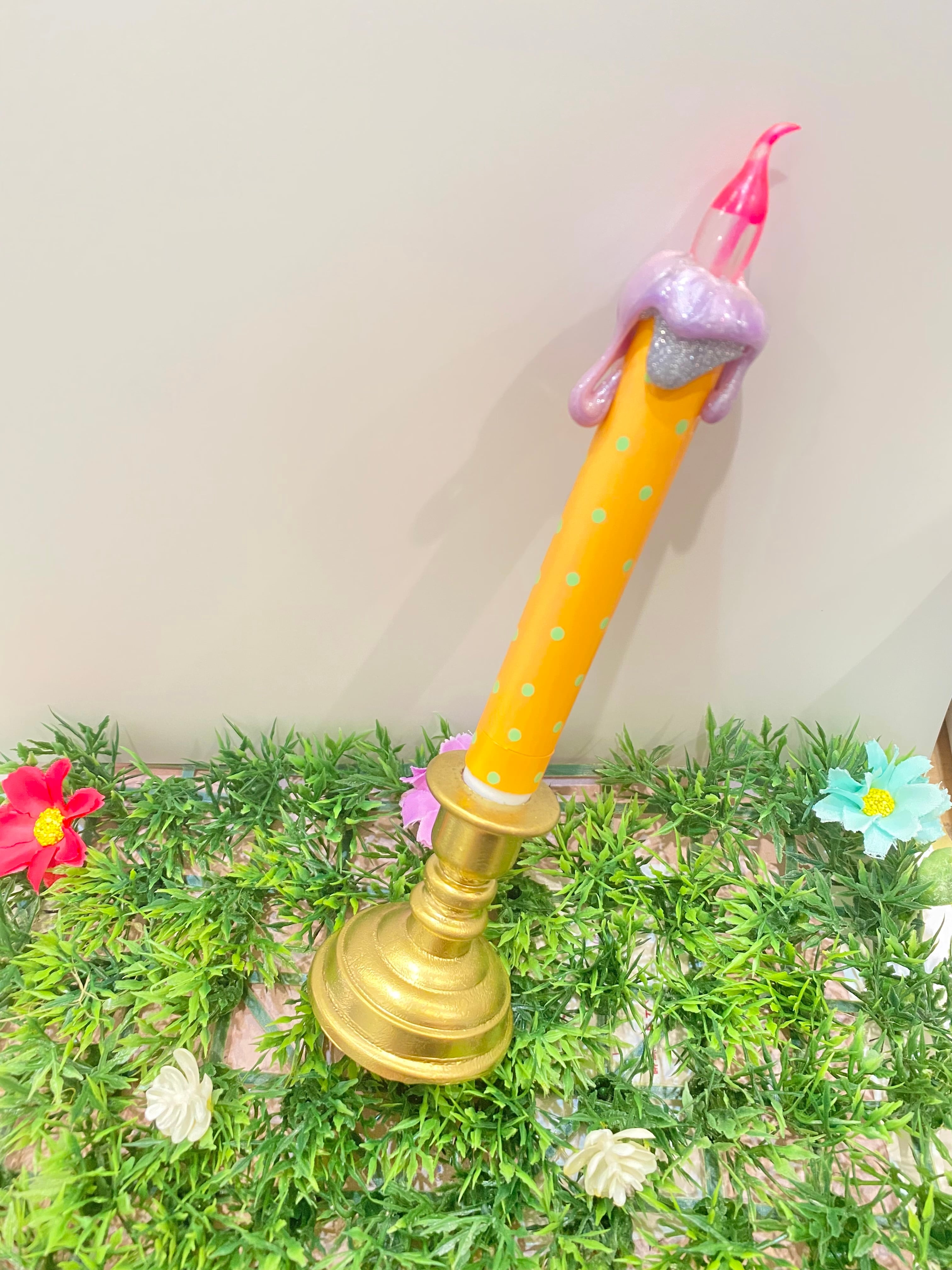 電池を入れて、ロウソク部分を下にカチッと押すと…まるでロウソクを灯したようにゆらゆら灯りがつきます⭐︎